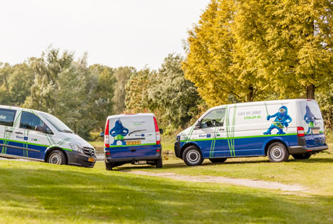 Sinds kort rijden de servicemonteurs van Cyklop in opvallende nieuwe bedrijfswagens door Nederland. Wie de wagens tegenkomt zal zeker twee keer gaan kijken. Op de zij- en achterkant van de wagens lacht u namelijk breed een grote blauwe cycloop toe.