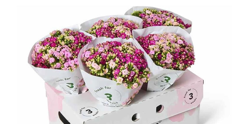 De boeketdoos, gemaakt van golfkarton, is geschikt voor drie tot vijf Kalanchoë-boeketten. De dozen zijn voorzien van twee verschillende deksels: één deksel met vijf gaten voor kleinere boeketten en één deksel met drie gaten voor de grotere boeketten.